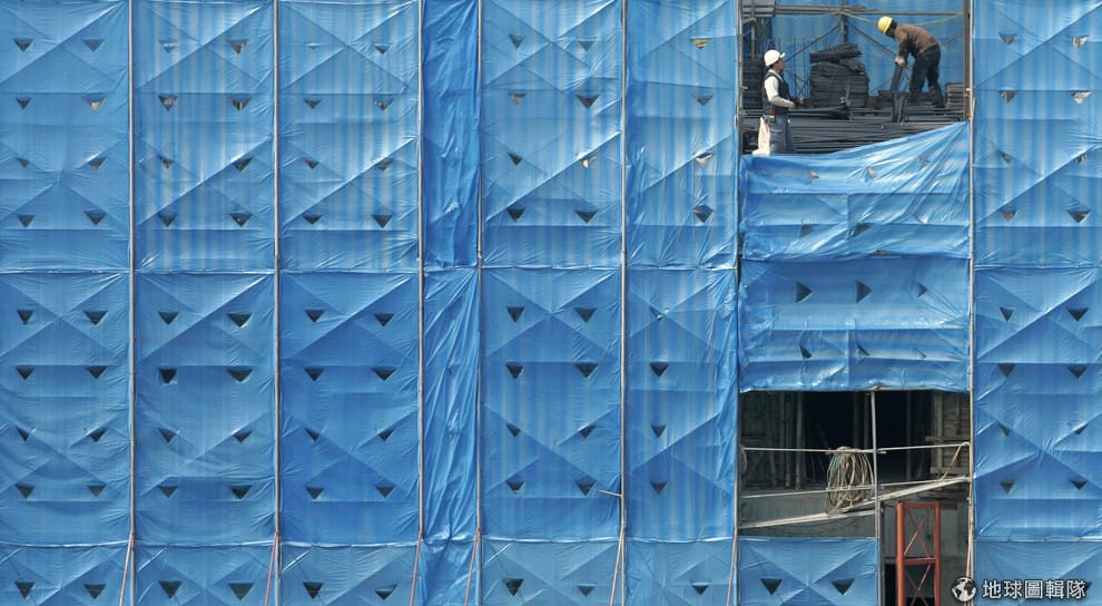 在台北街頭,工人們正在工地裡忙碌著。
