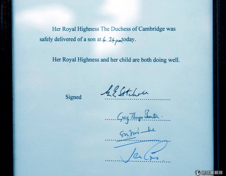 7/25更新:這位小王子的名字確定為「喬治‧亞歷山大‧路易斯」(George Alexander Louis),封號為「劍橋喬治王子」(His Royal Highness Prince George of Cambridge.)。根據《衛報》24號報導,喬治這個名稱其實已經在英國王室出現多次,1714年英國的漢諾威王喬治一世(George I of Great Britain)就是使用此名;此外,威廉王子的祖父也是以喬治為名。