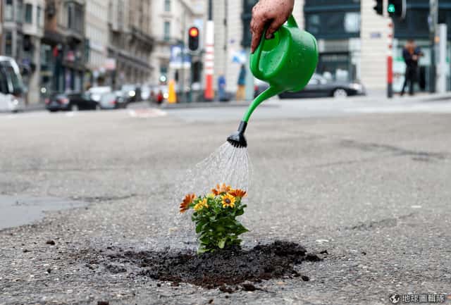 在比利時首都布魯塞爾(Brussels),一名居民在馬路的坑洞上栽種盆栽,藉此抗議當局遲遲不來修補道路。