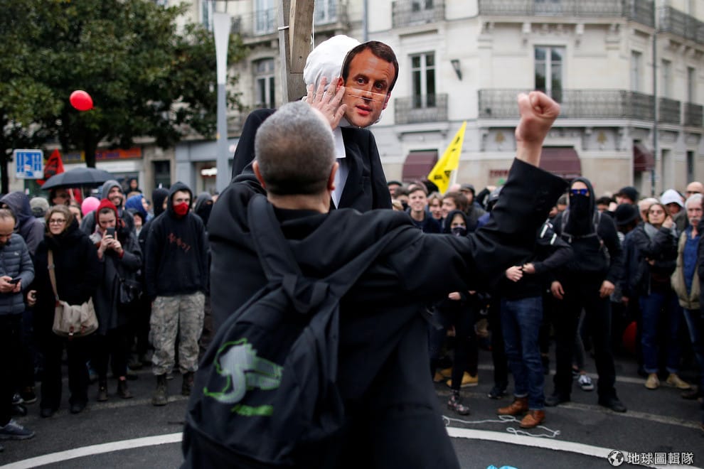 一名示威者正在毆打象徵法國總統馬克宏(Emmanuel Macron)的假人,希望可以有更多法國國營鐵路(SNCF)員工、學生加入罷工示威行動。