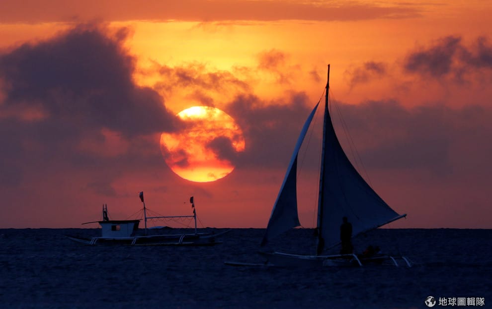 圖為本月 8號,在長灘島的遊客們乘著帆船欣賞夕陽烙下的美景。