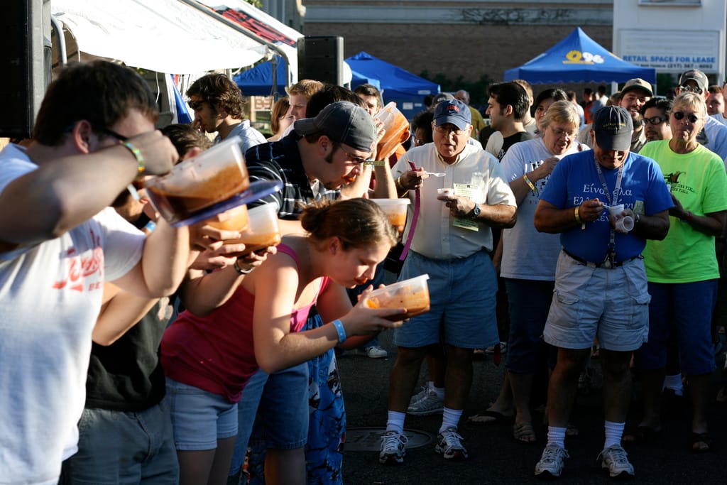 圖為 2007年,在美國厄巴納(Urbana)的一場吃辣比賽上,選手們每個人都抱著辣椒醬盡全力地吃著。