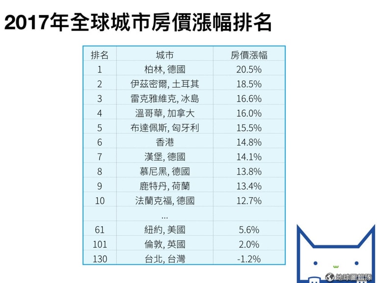 昨日(10),全球不動產仲介及顧問公司萊坊(Knight Frank)公布了針對 150個城市所做的 2017年房價調查,指出德國首都柏林(Berlin)平均房價上升 20.5個百分比,一躍成為 2017年房價漲幅最高的城市。