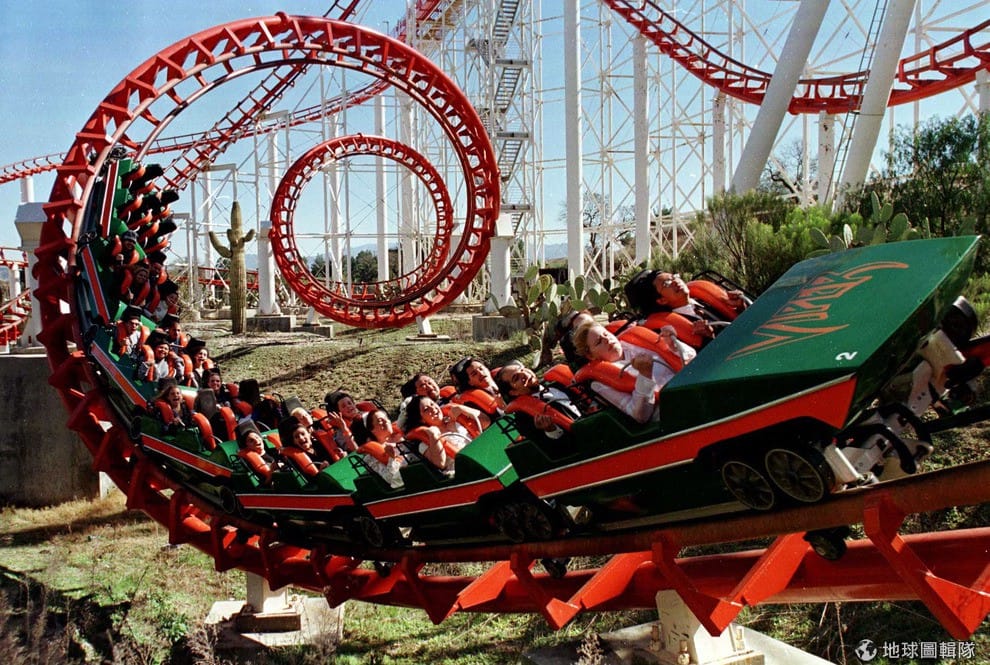 照片中是六旗遊樂園的毒蛇雲霄飛車(Viper rollercoaster)