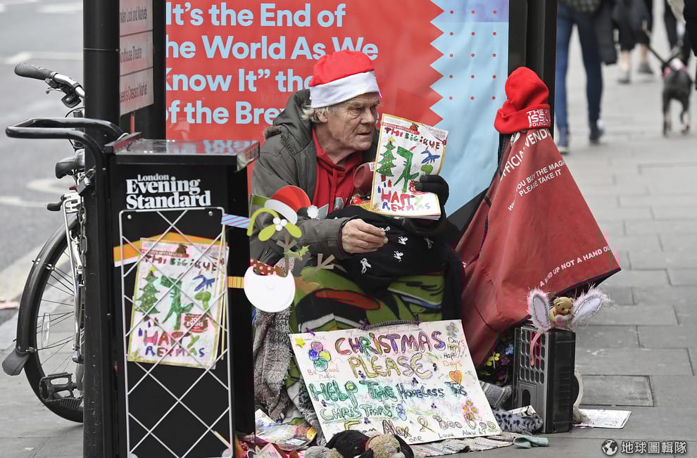 圖為 2016年12月,在英國倫敦,一名街友販售著聖誕節特別版的《大誌》雜誌。
