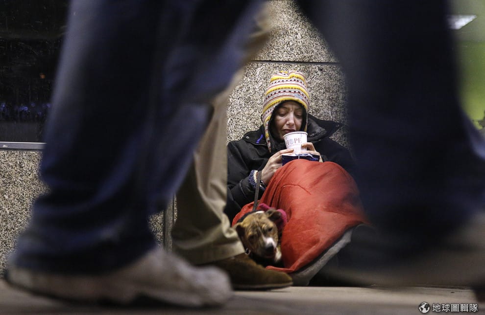圖為 2012年12月,一位街友窩在睡袋裡取暖,她的狗也貼在身邊一起取暖。