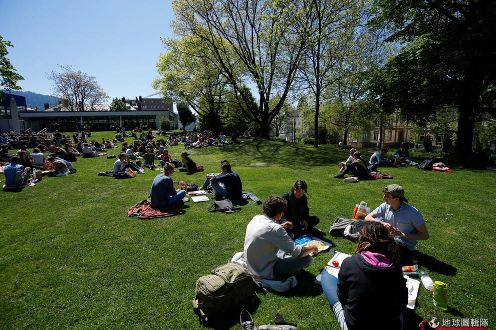 一群大學生坐在草地上,享受著舒適的春日陽光。