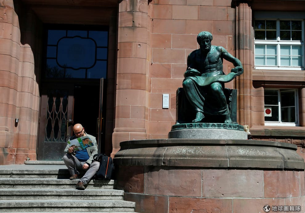 在德國佛萊堡大學外,一名男子坐在雕像旁閱讀著手上的刊物。