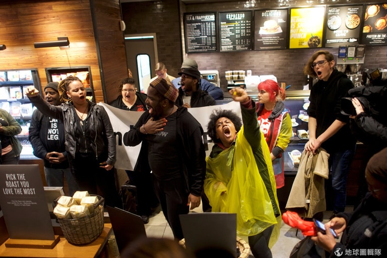 周一(16),不滿星巴克趕人的民眾來到事發當時的費城星巴克抗議,他們入內大喊「任何地方反對黑人就是反對所有地方的黑人」。負責組織抗議活動的穆漢默德(Abdul-Aliy Muhammad)說:「我們不想讓這間星巴克今天能賺錢,這是我們的目標。」