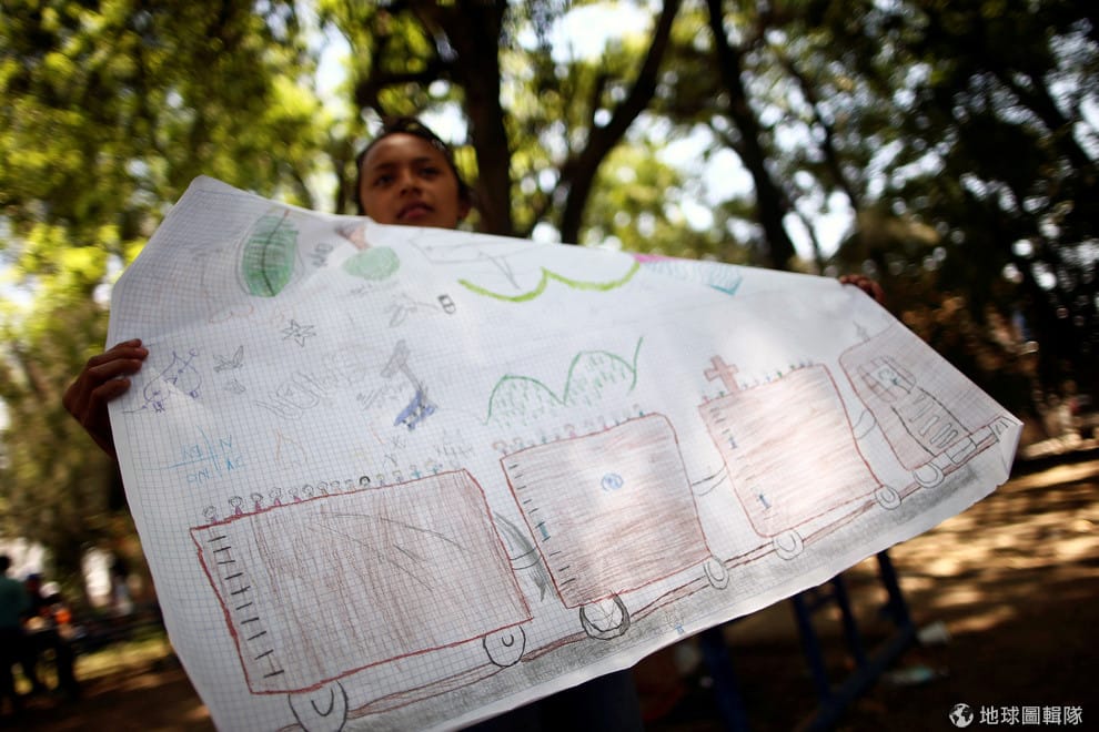 在位於瓜納華托州(Guanajuato state)的臨時移民收容所,今年 14歲來自瓜地馬拉的凱瑟琳(Katherine)對著鏡頭展現自己的畫作,她用畫筆描繪了自己是如何搭著貨運列車從母國來到墨西哥,希望可以找到新的家園落地生根。