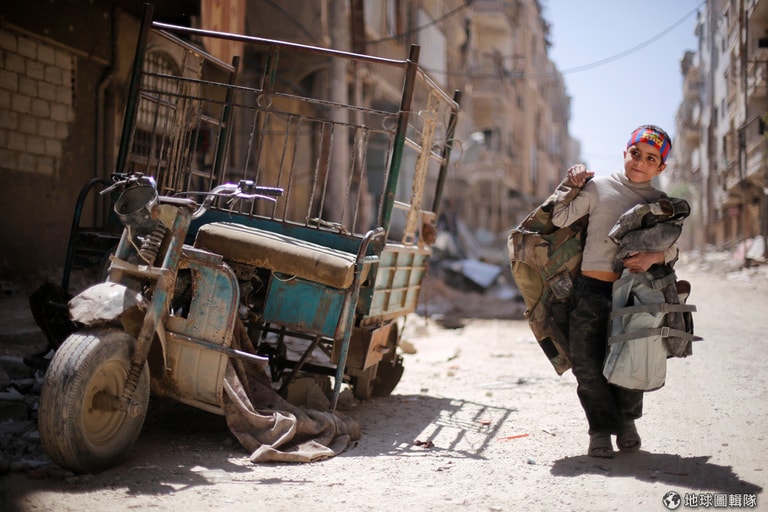 在近日疑似遭到敘利亞當局化武攻擊的反政府軍佔領城鎮杜馬(Douma),一名小男孩拿著迷彩背心在斷垣殘壁間行走。
