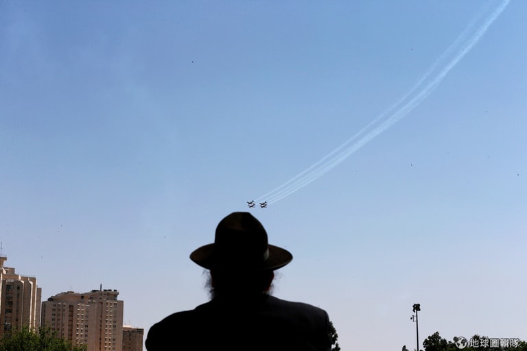 在耶路撒冷,一名猶太正教的信徒看著天空中正在預演的以色列空軍特技隊,他們即將用高超的飛行技術慶祝以色列獨立建國 70年。