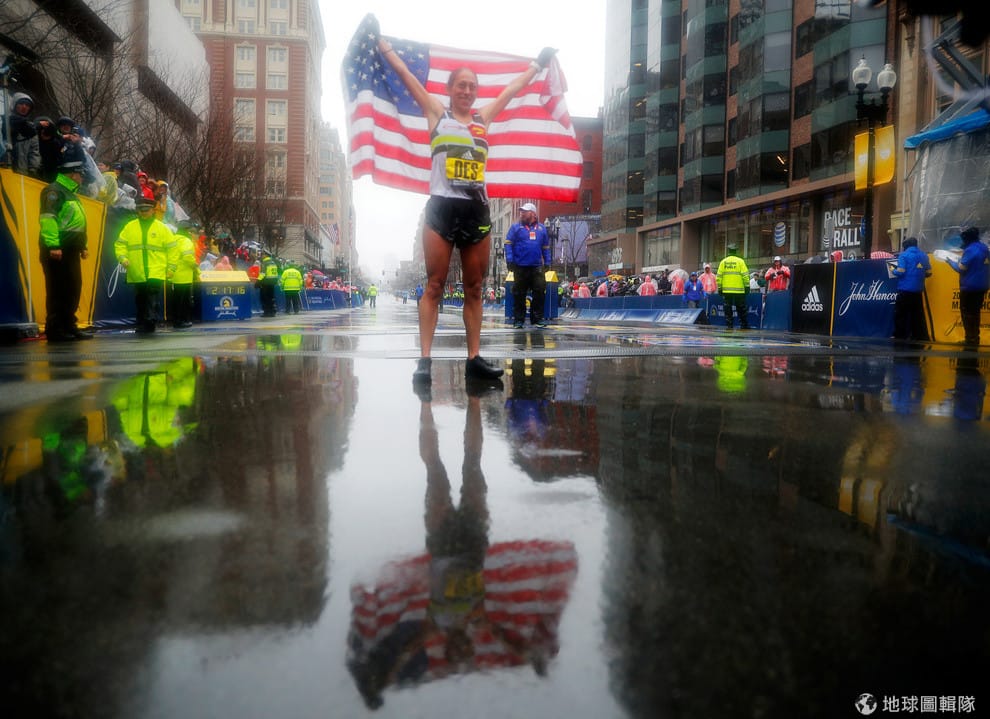 16號這天,美國選手林登(Desiree Linden)高舉美國國旗,開心慶祝自己成為波士頓馬拉松賽女子組中,首位奪金的美國選手。