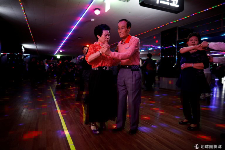 在首爾的一處現代集團旗下的建築物內,上了年紀的紅男綠女正在享受迪斯可的迷幻時光。