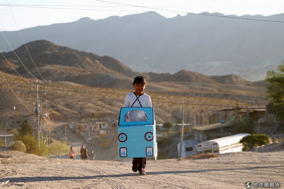 在華瑞茲城(Ciudad Juarez),今年 9歲的賈茲敏(Jazmin)穿著特地為學校表演做的汽車裝,在大街上走著。