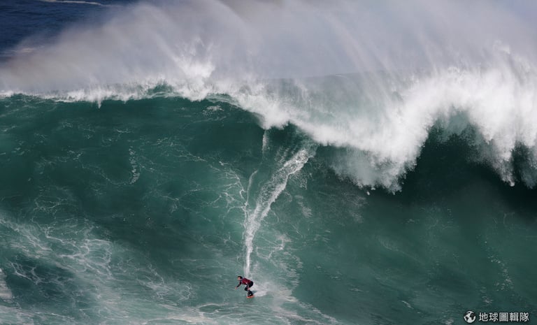 在中部城鎮納札雷(Nazare)的北灘,西班牙衝浪好手慕尼安(Axi Muniain)挑戰來襲的大浪。