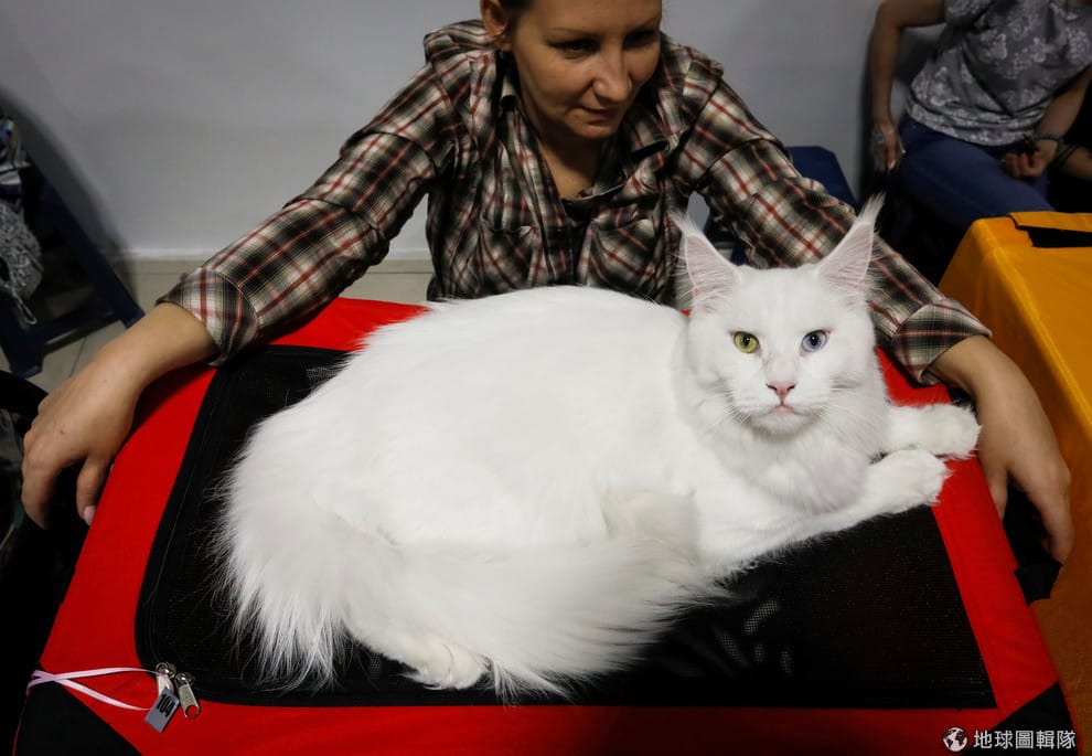 在第一大城阿拉木圖(Almaty),一名女子在貓咪展覽上端出她養的白色緬因貓,這種貓的體型巨大,因此在貓界又有「溫柔的巨人」這樣的封號。