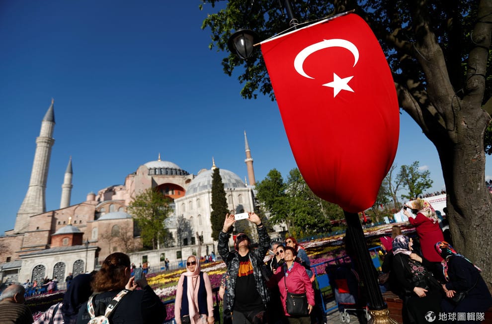 在伊斯坦堡的聖索菲亞大教堂(Hagia Sophia),觀光客開心地拍照留念。