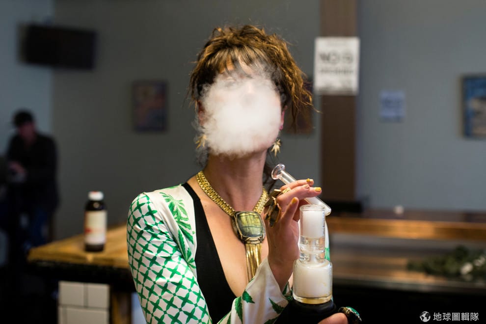 在加州奧克蘭的一間大麻吧裡,一名女子正在享受吞雲吐霧的快感。