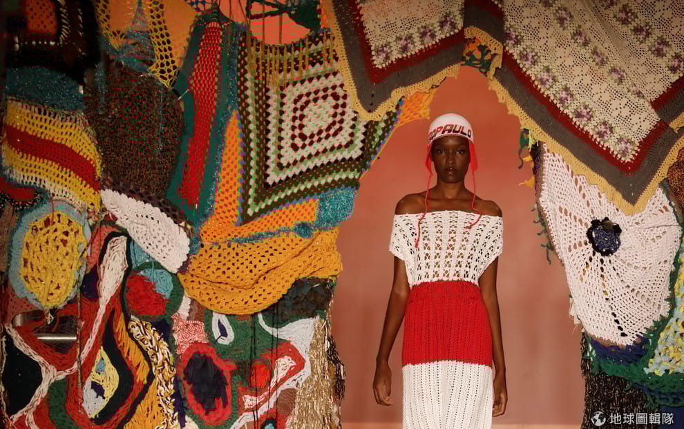 在聖保羅時裝周上,一名模特兒正在展示設計師的編織作品。