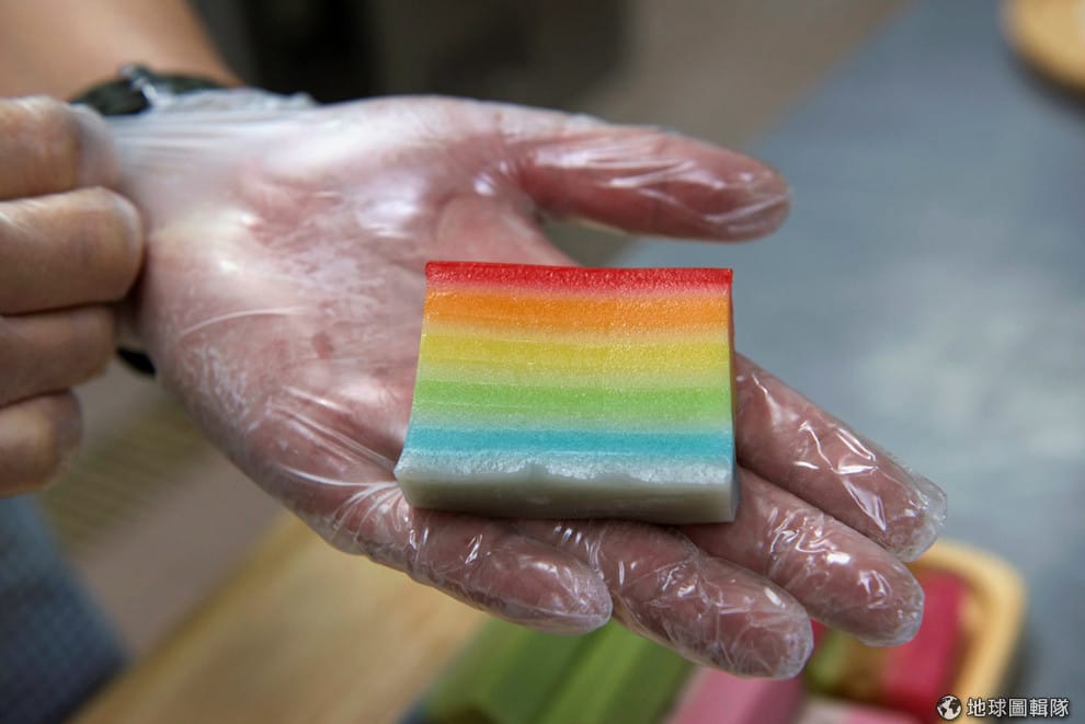 在新加坡,一塊彩虹娘惹糕躺在傳統娘惹糕店HarriAnns第三代經營者Alan Tan的手上。