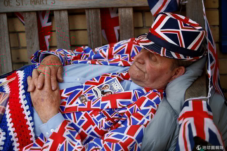 在倫敦聖瑪麗醫院(St Mary's Hospital)前,一名身穿英國國旗裝的民眾正在等待凱特王子妃(Kate Duchess of Cambridge)的第三個孩子出生。