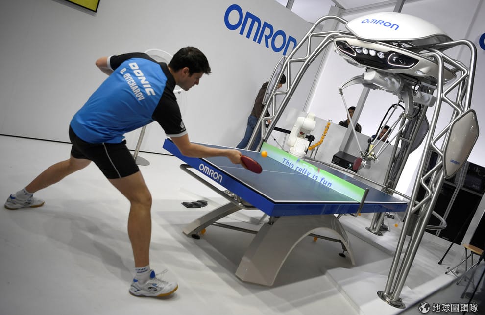 在全球最大工業展「漢諾威工業展」(Hannover Fair)上,德國桌球選手歐福夏夫(Dimitrij Ovtcharov)和桌球機器人Forpheus你來我往打桌球。