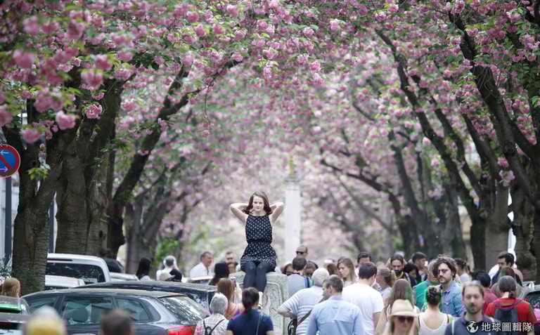 在波昂(Bonn)盛開的櫻花樹下,一名女子坐在石碑上,與後方的櫻花大道一同合照。
