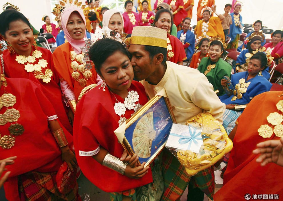 圖為 2011年11月在印尼南蘇拉威西省的一場大型聯合婚禮。印尼各州的傳統婚禮在服裝和儀式上都很不一樣。
