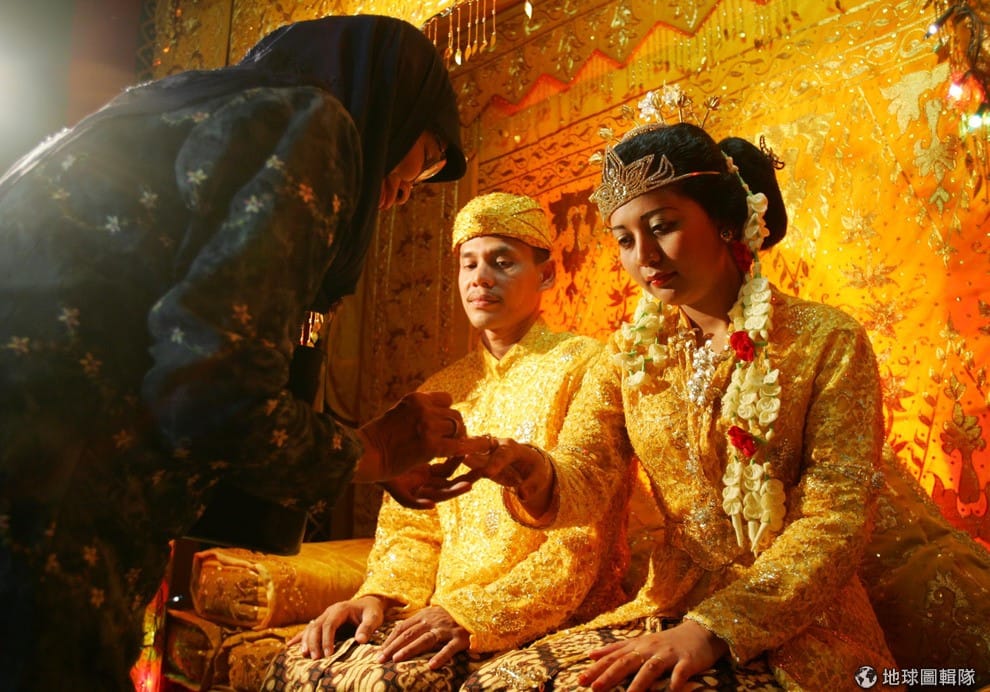 去年,有一群穆斯林神職人員表示,印尼政府應該盡快將法定結婚年齡提高為女生須年滿 18歲。圖為 2005年1月,在印尼班達亞齊一對新人接受來自年長女性的祝福。