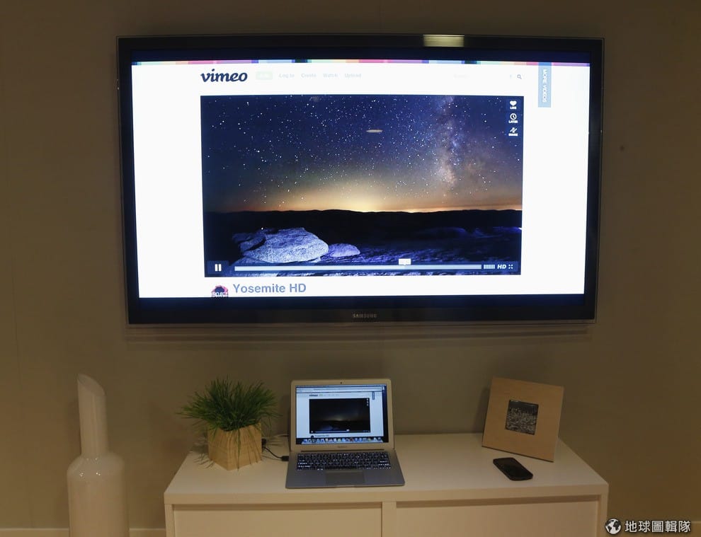 照片為Google示範Chromecast的應用,電腦畫面藉由Chromecast連接,將畫面放大到電視螢幕上。