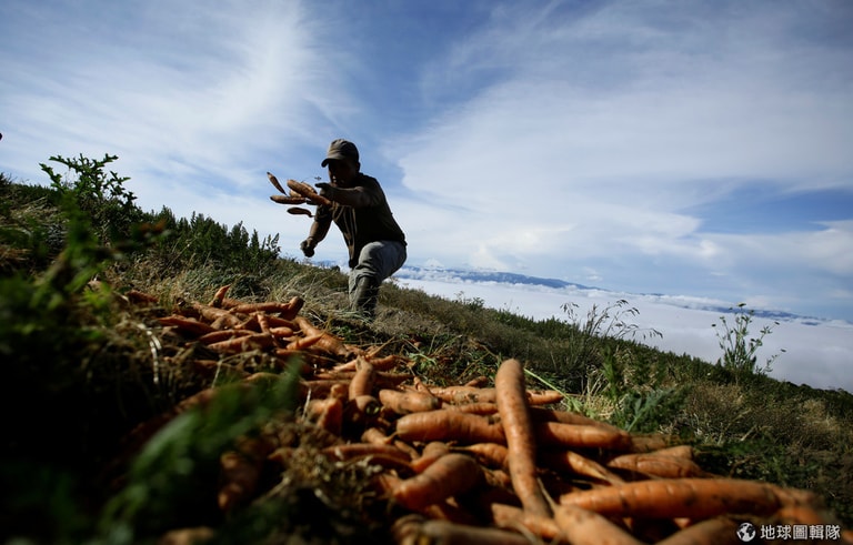 在胡蘿蔔大豐收的季節,一名農人辛勤地把胡蘿蔔從土裡拔出來。
