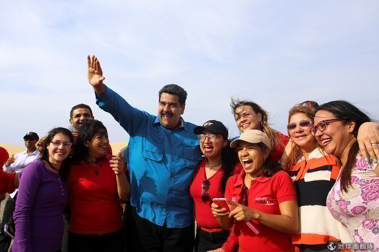 在委內瑞拉西北部的科羅市(Coro City),委內瑞拉總統馬杜洛(Nicolas Maduro)開心地和一擁而上的支持者合照。
