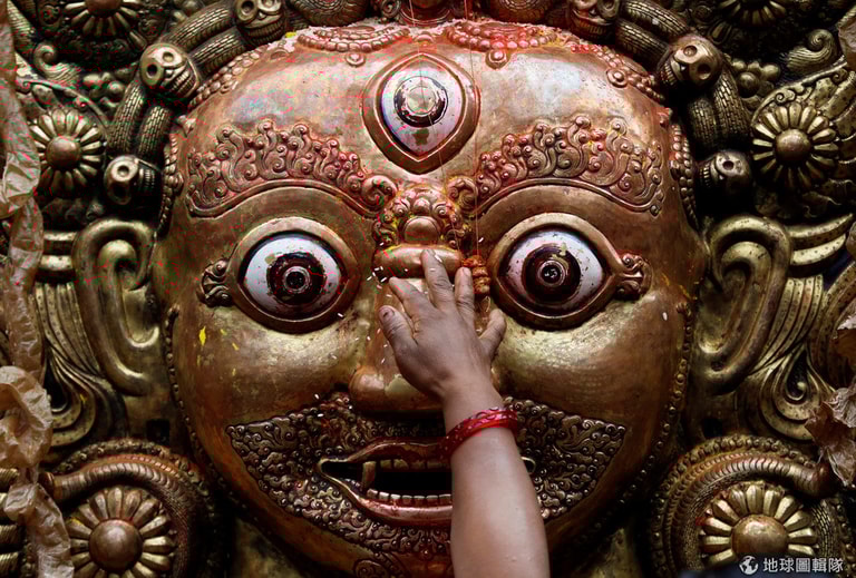 一名印度教信徒用米粒雨神Rato Machhindranath的戰車上,祈禱來年風調雨順,大家都能過個豐收的好年。