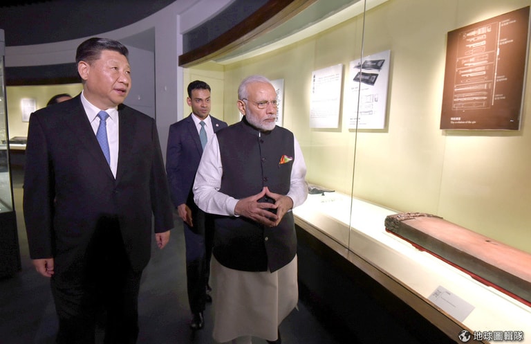 在河北省武漢博物館,中國領導人習近平帶著印度總理莫迪(Narendra Modi)參觀歷史文物。