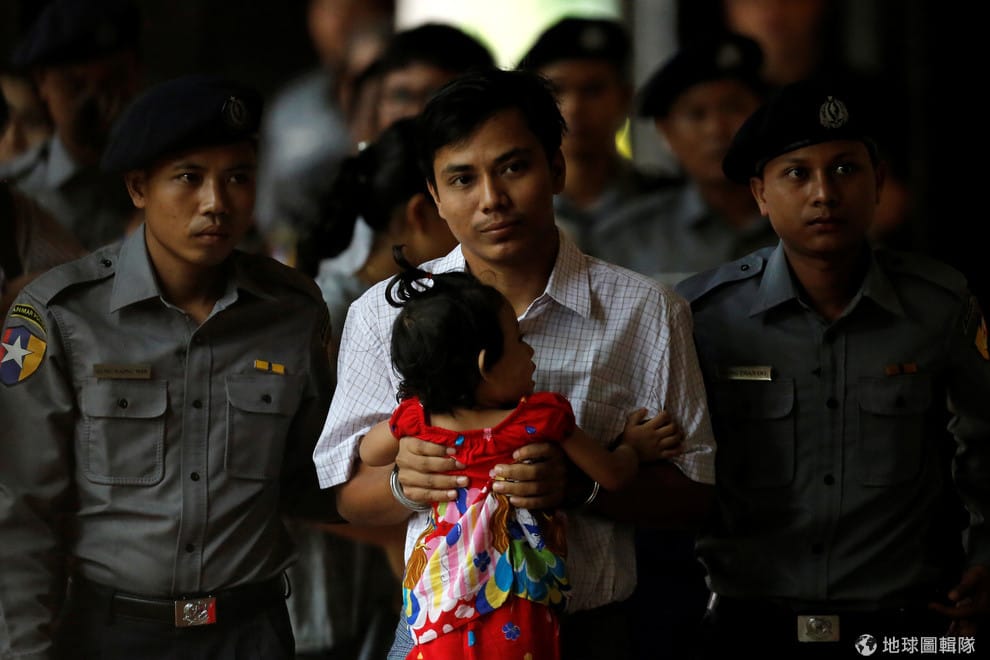 被當局拘留的《路透社》記者喬索歐(Kyaw Soe Oo)抱著他的女兒,在前往聽證會的路上。他與另一名記者瓦隆(Wa Lone)被控違反緬甸的《國家機密法》(Official Secrets Act),該罪刑最高會被處以 14年刑期。
