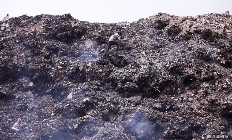 在剛剛焚燒完垃圾的垃圾場,一名男子正在裡頭尋找可回收的物品。
