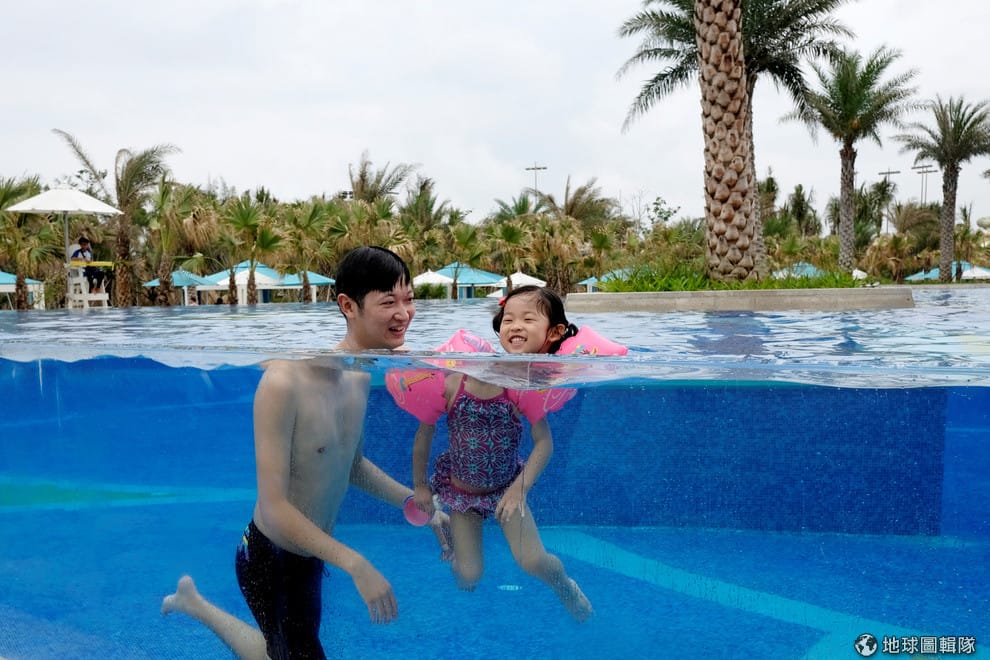 在海南省三亞市,一名住在度假村的遊客和他的女兒正在游泳池嬉戲。