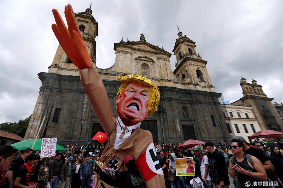 在哥倫比亞首都波哥大(Bogota),一名示威者拿著身穿納粹軍服的美國總統川普(Donald Trump)人偶上街上議。