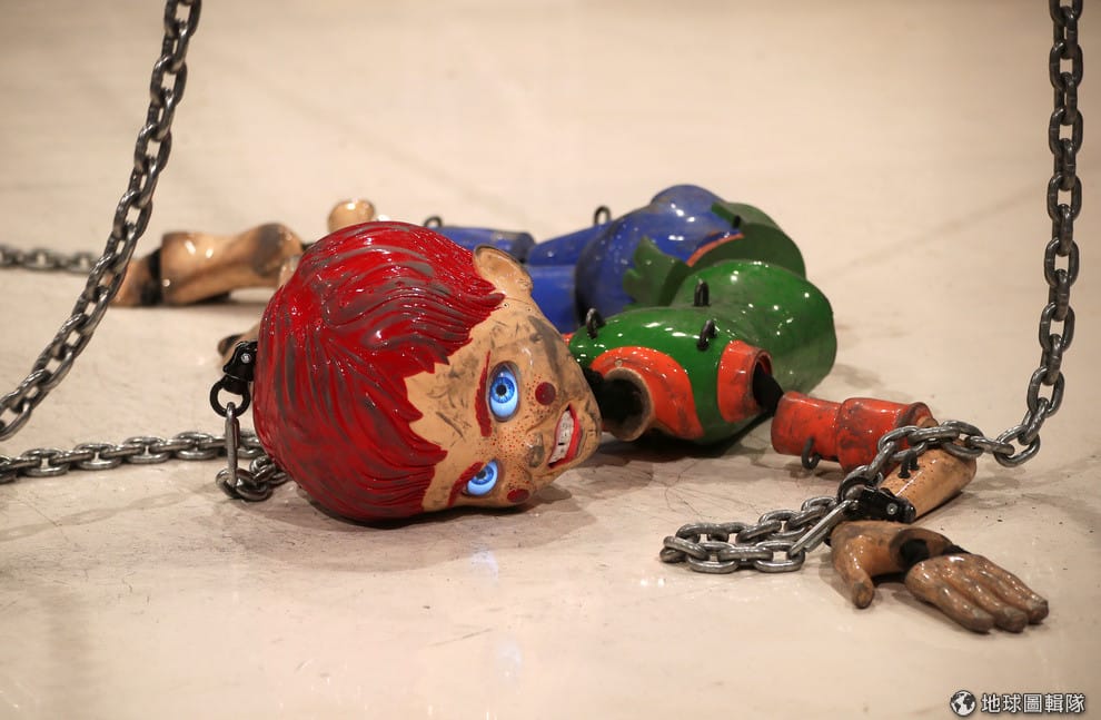 畫面中名為「上色雕塑」(Colored Sculpture)的作品即將在倫敦的泰特現代藝術館(Tate Modern)展出。這是藝術家沃夫森(Jordan Wolfson)的作品,觀展者可以透過按鈕操縱鎖鍊來掌控這具傀儡,也可以鬆開鎖鍊讓它直接被摔在地上。