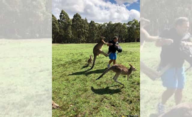 在這張擷取自社群媒體、日期不明的照片中,一隻袋鼠正在攻擊試圖餵食牠的男子。