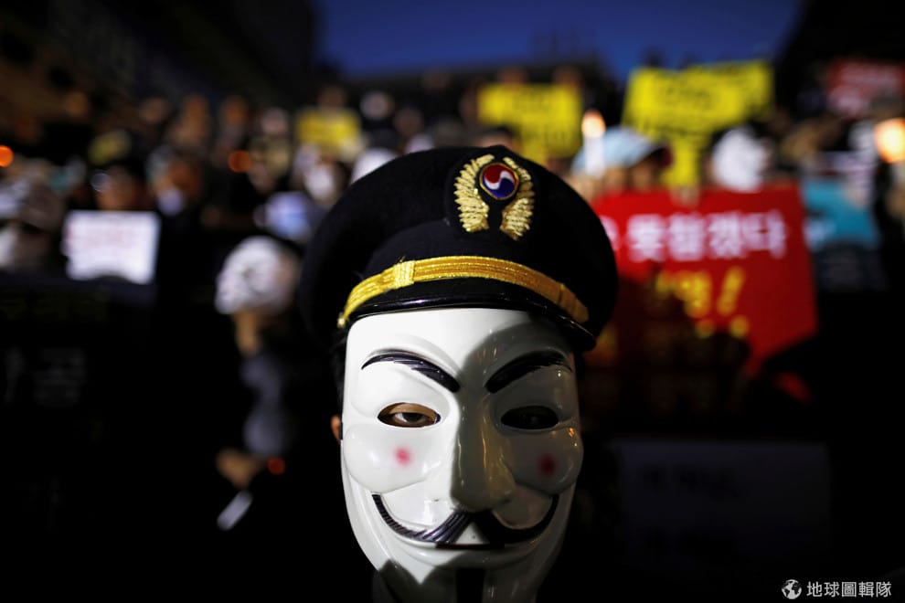 一名隸屬大韓航空的空服員上街參加遊行,抗議大韓航空會長的家庭成員長期濫用權力的作為。