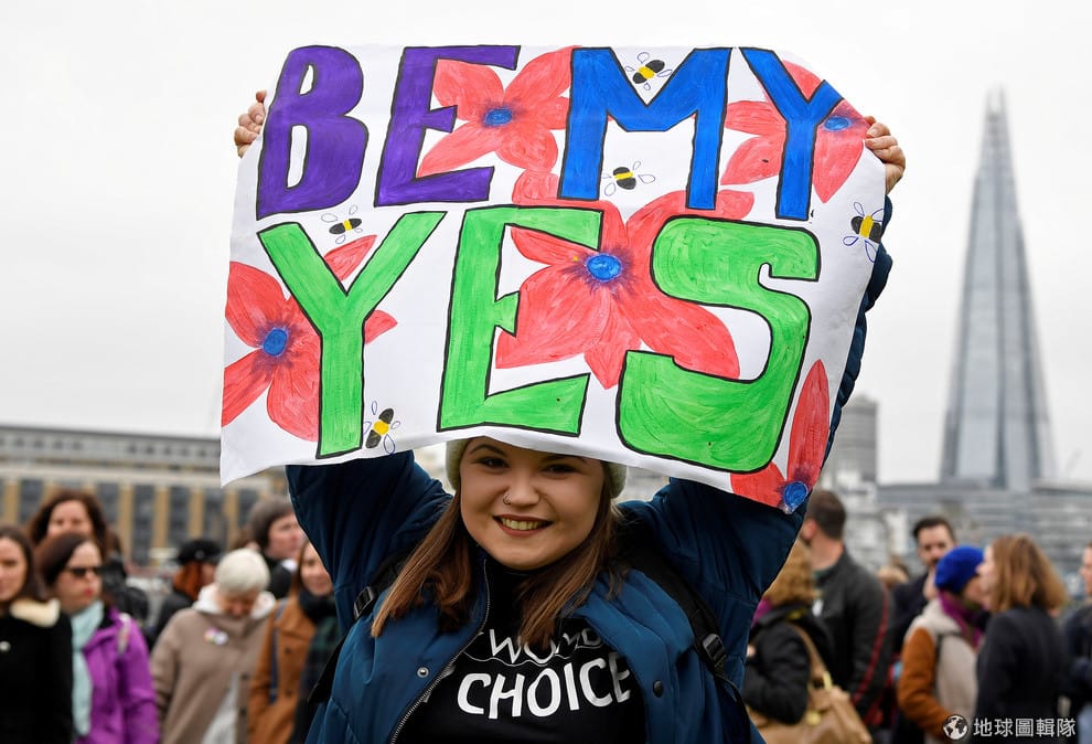 面對愛爾蘭墮胎公投在即,一名支持墮胎權的倡議團體手持標語、海報,在倫敦的街頭示威者。