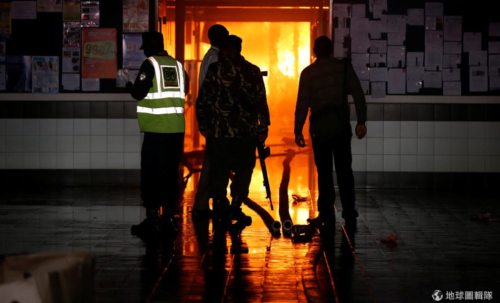 在肯亞首都奈洛比(Nairobi),消防人員正忙著將百貨公司的大火給撲滅。