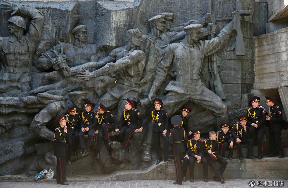 在烏克蘭首都基輔(Kiev)的二戰博物館,一群軍校成員在參加完慶祝二戰勝利 73周年的活動後,一同在外頭休息著。