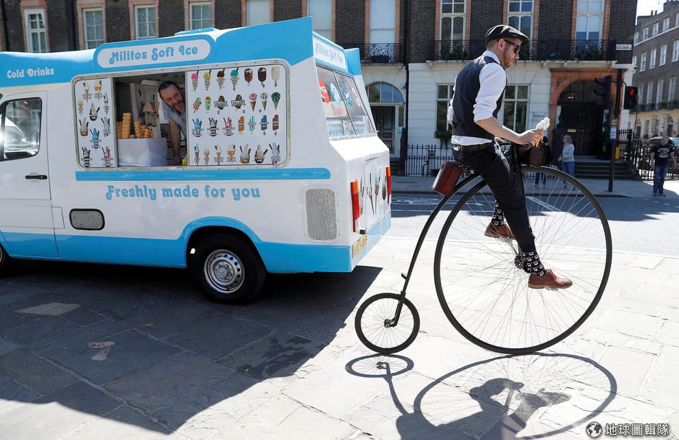 一名「花呢單車日」(Tweed Run)的參加者剛剛向冰淇淋車買了一捲冰淇淋。每到「花呢單車日」這天,許多人就會穿著帶有濃濃英倫風情的花呢衣裳,騎著經典單車繞行倫敦市區,重現往日英倫仕紳的日常生活。