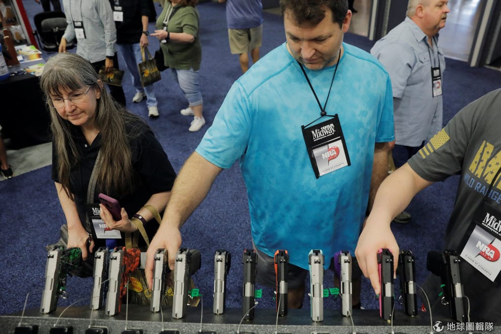在全美步槍協會(National Rifle Association, NRA)的年會上,槍枝擁護者在會議現場研究著各式各樣的手槍。