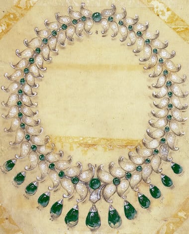 巴羅達大公夫人於1950年訂製的 Lotus 項鏈(又名 Hindu 項鏈)。由13顆總重達154.7克拉的梨形哥倫比亞祖母綠組成,懸浮在蓮花形狀的鋪鑲鑽石中央,鏈身由數十顆祖母綠和鑽石組成,而且最值得一提的是,這些寶石均來自巴羅達大公的王冠。圖片來源/Van Cleef & Arpels
