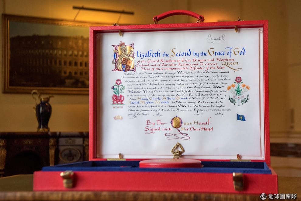 在倫敦白金漢宮,皇室向媒體展示英國女王伊莉莎白二世(Elizabeth II)批准孫子哈利王子(Prince Harry)和美國女星梅根馬克爾(Meghan Markle)結婚的同意書,他們特地請來了皇室御用藝術家用花形字體寫下了兩人的名字,右上角則有女王的簽名,藉此祝福這一對即將在 5月19日成婚的準新人。