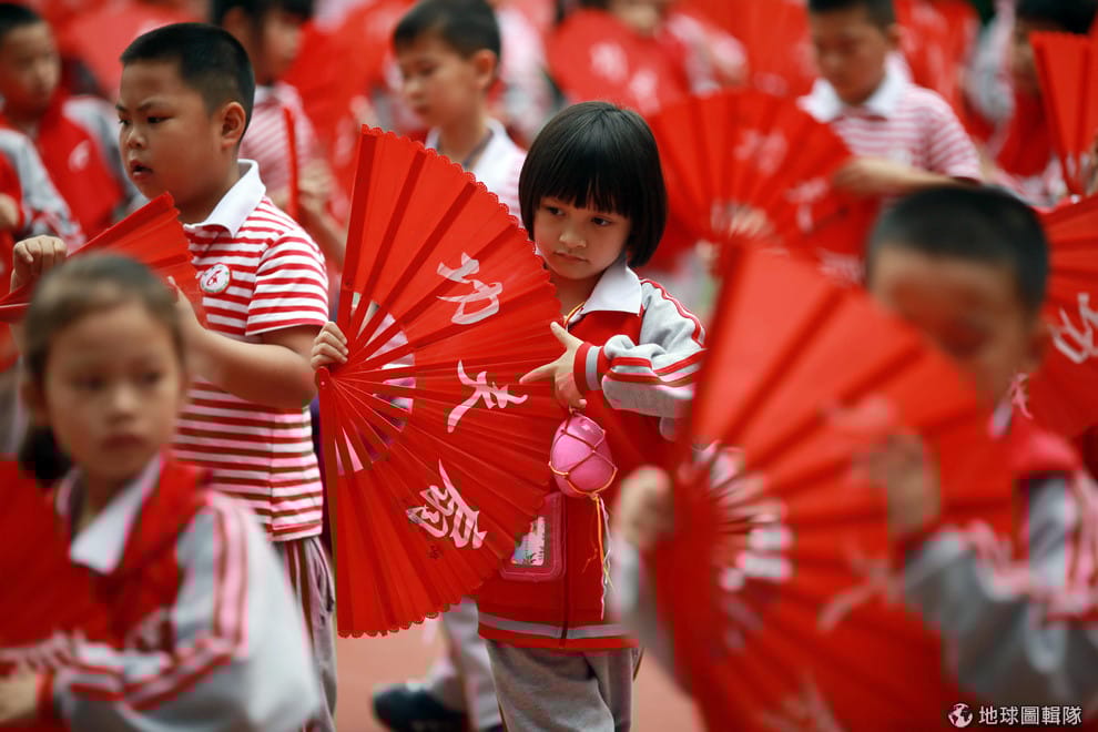 在廣西壯族自治區的桂林市,小朋友舞動著鮮紅色的功夫扇,展現苦練多時的成果。